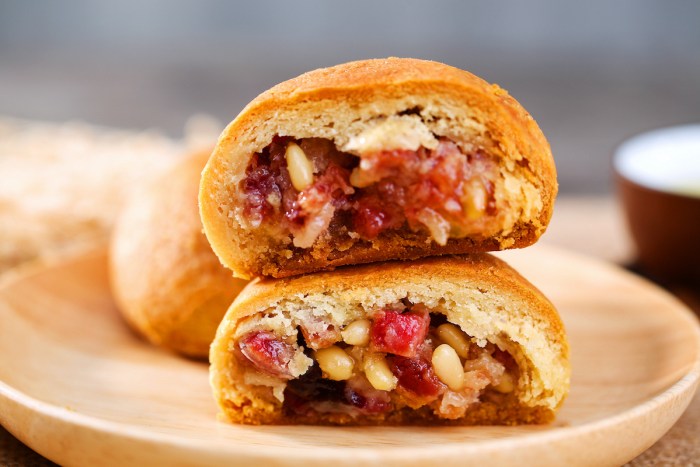 The name of each kind of cake is usually based on the main ingredients of the cake filling, such as five kernels, golden ham, lotus paste, bean paste, jujube paste, coconut paste and so on. The range of Cantonese moon cake fillings are wide, such as salted egg yolk, preserved egg, sausages, char siu, shredded chicken, roasted duck, mushrooms, etc..